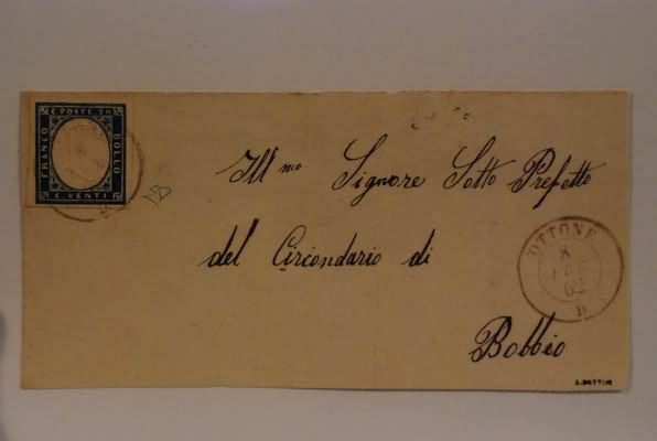 REGNO DI SARDEGNA ANNULLAMENTI - 1862, OTTONE (p.R2) doppio cerchio rosso su 20 c.(15E) ben marginato su frontespizio completo di lettera con un lembo ripiegato. Rarità. (E. Diena) (Cat. 4500/20000).(FRAMMENTO)