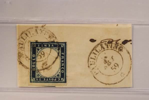REGNO DI SARDEGNA ANNULLAMENTI - 1859, PAULILATINO doppio cerchio (p.8) su 20 c. (15B), su frammento.(FRAMMENTO)