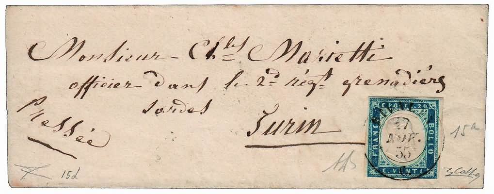 REGNO DI SARDEGNA ANNULLAMENTI - 1855, RIVALTA (p.12) su 20 c.cobalto latteo vivace (15d) su lettera per Torino nel novembre del '55. Grande freschezza, e grande rarità per l'uso nel novembre. (A.Diena - Colla - Cert.Bottacchi).(LETTERA)