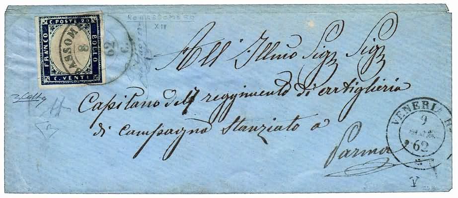 REGNO DI SARDEGNA ANNULLAMENTI - 1862, ROBASSOMERO (p.R2) su 20 c.indaco (15E) su lettera diretta a Parma l'8/3/62. A lato doppio cerchio di "Veneria Reale". Annullo rarissimo. (A.Diena - Colla - Cert.E.Diena)(LETTERA)