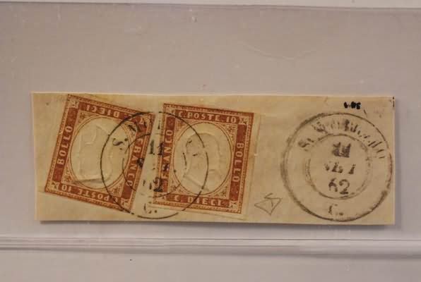 REGNO DI SARDEGNA ANNULLAMENTI - 1862, S. MORIZIO (p. 7) su 10 c. (14Dg) 2 esemplari, uno con margine a filo, su piccolo frammento. (E. Diena).(FRAMMENTO)