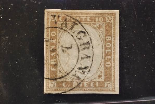 REGNO DI SARDEGNA ANNULLAMENTI - 1859, VALGRANA (p. 12) su 10 c. (14Ae). Esemplare da esaminare per uno strappo a sinistra.(USATO)