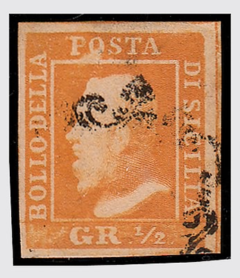 Lotto 1249 | SICILIA - 1859, 1/2 gr. arancio, I tavola, carta di Napoli (1a) posizione...