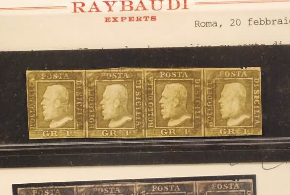 Lotto 1262 | SICILIA - 1859, 1 gr. II tavola bruno oliva (4b) striscia orizzontale di 4,...