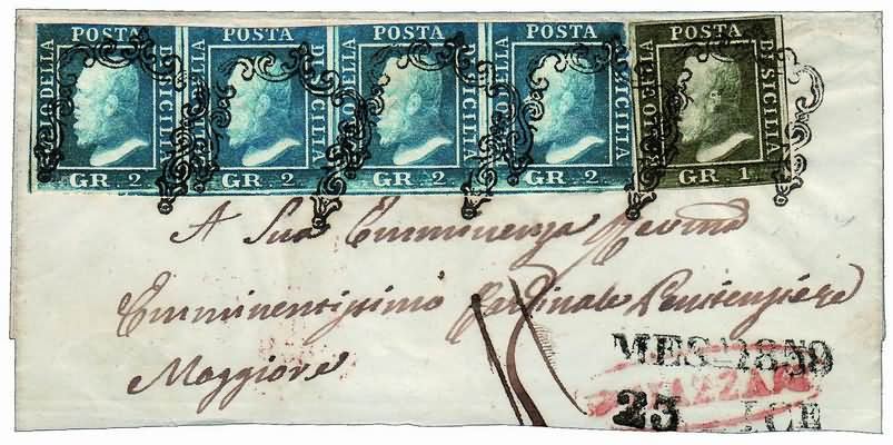 SICILIA - 1859, gran parte di lettera spedita da Mazzara (p.9) il 28/12/59 diretta a Roma con transito a Messina e a Napoli, affrancata con striscia di quattro del 2 gr. III tavola (8) + 1 gr. III (5) tavola. Francobolli molto freschi, leggermente difetto