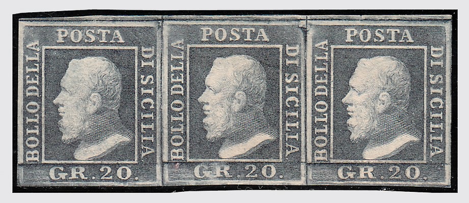 SICILIA - 1859, 20 gr. grigio ardesia (13) striscia di tre fresca e ben marginata. (A. Diena - Cert.Colla).(GOMMA ORIGINALE)