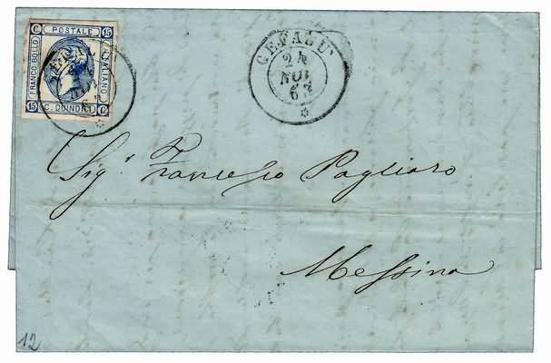 SICILIA ANNULLAMENTI - 1863, CEFALU' doppio cerchio (p.12) su 15 c. (13) su lettera per Messina, 24/4/63.(LETTERA)