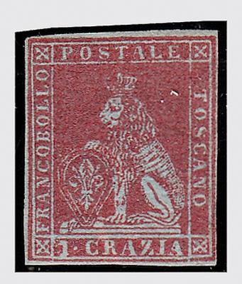 Lotto 1397 | TOSCANA - 1851, 1 cr. carminio violaceo su azzurro (4c) ottimamente...