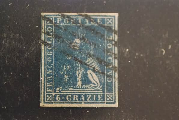 Lotto 1452 | TOSCANA - 1857, 6 crazie azzurro (15) ben marginato. (Donnini).(USATO)