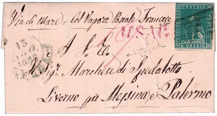 TOSCANA - 1858, 6 cr. azzurro vivo (15a) su lettera da Livorno per Palermo, 13/8/58, con tagli di disinfezione. (Raybaudi).(LETTERA)