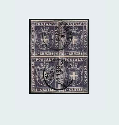 TOSCANA - 1860, Governo provvisorio, 1 c. violetto scuro (17c) blocco di quattro annullato con bollo di Firenze il 14/9/60. Raro, molto fresco. (A.Diena esteso - Cert.E.Diena).(USATO)