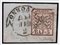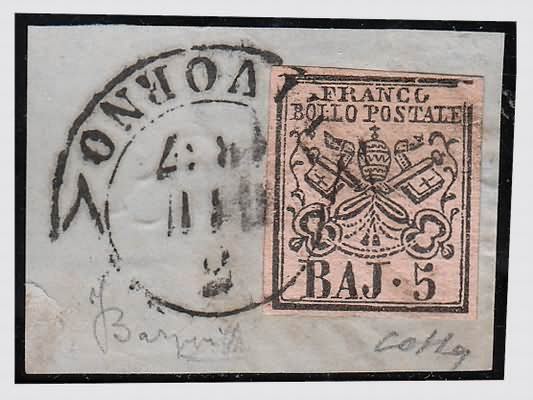 TOSCANA ANNULLAMENTI - 1857, LIVORNO cerchio a banderuola, annullatore di Pontificio 5 bay (6) in arrivo o in transito, su frammento. Per specialisti. (Cert. Colla).(FRAMMENTO)