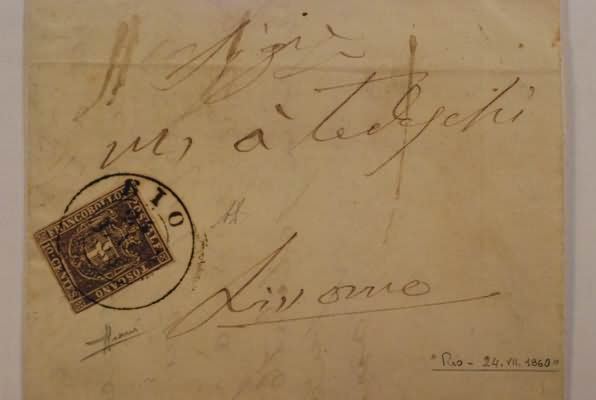 TOSCANA ANNULLAMENTI - 1860, RIO doppio cerchio grande (p.12) su 10 c.bruno (19) con buoni margini su lettera per Livorno il 24/7/60. Raro. (A.Diena - Sorani).(LETTERA)