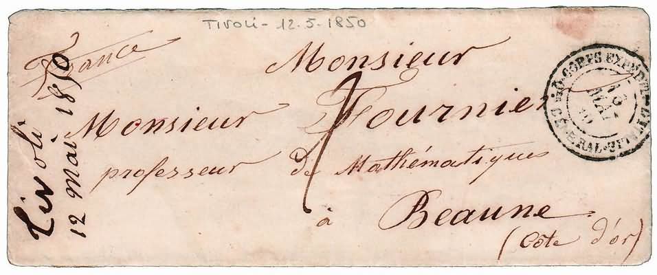RISORGIMENTO - 1850, bustina con contenuto interno da Tivoli per la Francia, 18/5/50, spedita da soldato francese di stanza nello Stato Pontificio. A lato doppio cerchio "Corps Expedit.e d'Italie / Q.er General".(LETTERA)