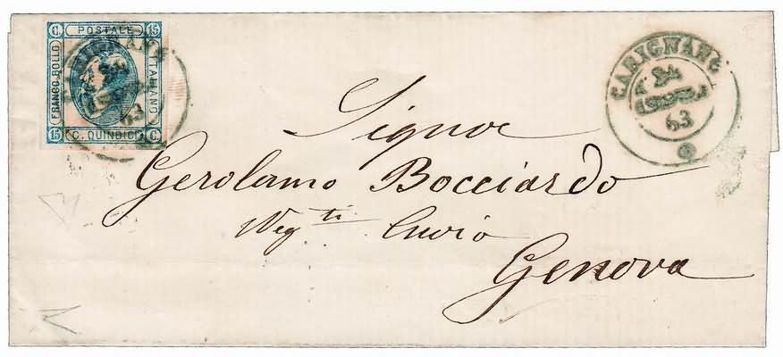 REGNO D'ITALIA ANNULLAMENTI - 1863, CARIGNANO (p.13) su 15 c.azzurro i tipo (12) doppio cerchio azzurrastro, su lettera per Genova il 24 luglio 1863. (Cert. Bottacchi).(LETTERA)