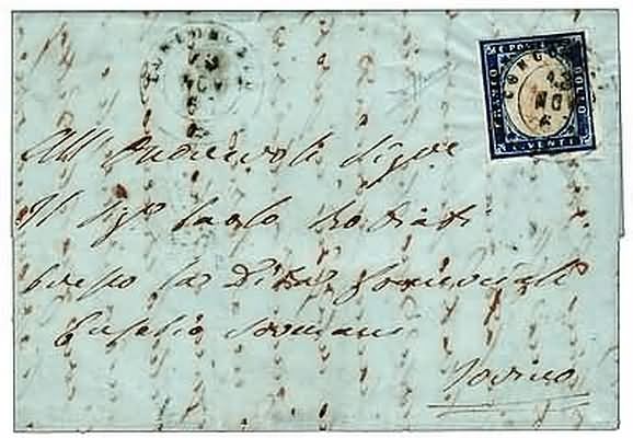 REGNO D'ITALIA ANNULLAMENTI - 1860, CONCOREZZO doppio cerchio (p.11) su Sardegna 20 c. (15C) su lettera per Torino, 13/11/60, prima data nota riportata dal Sassone. Di pregio. (Cert. Sorani).(LETTERA)