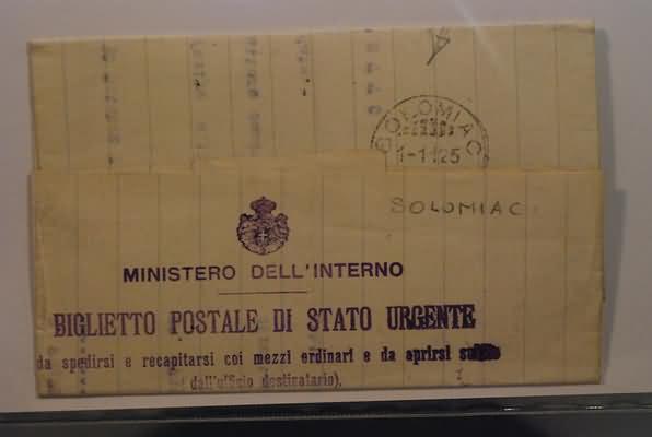 REGNO D'ITALIA ANNULLAMENTI - 1925, SOLOMIAC, frazionario, al verso di Biglietto di Stato Urgente da Torino al Sindaco di Desertes. Entrambi i comuni, Desertes e Solimiac, ora completamente disabitati.(LETTERA)