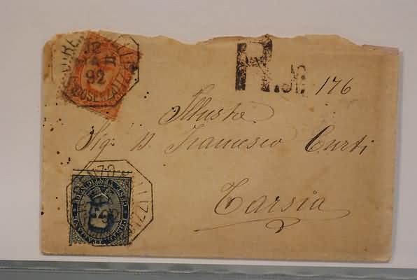 COLLETTORIE - 1892, S. LORENZO RODIZZI / (COSENZA), ottagonale su 20 c. + 25 c. (39+40) bustina raccomandata per Tarsia, 12/3/92.(LETTERA)