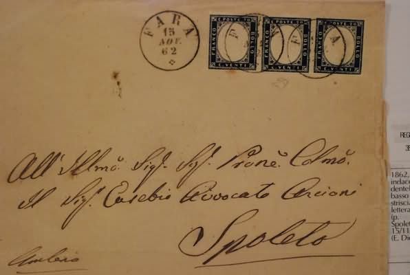 REGNO D'ITALIA - 1862, 20 c. indaco non dentellato in basso (2k) striscia di 3 su lettera da Fara (p. 7) per Spoleto, il 15/11/62. Rara. (E. Diena).(LETTERA)