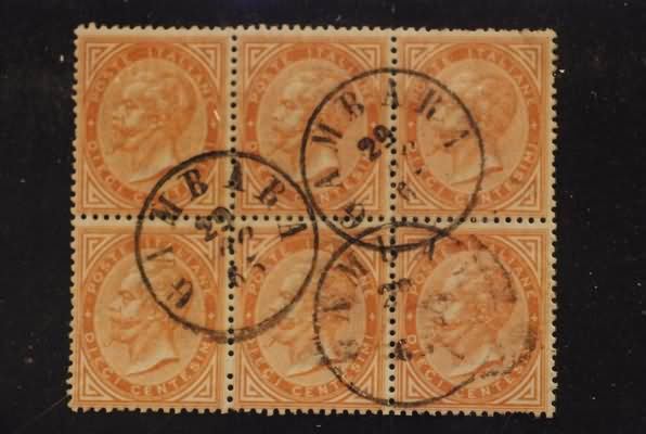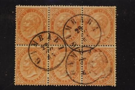 REGNO D'ITALIA - 1863, Tiratura di Londra, 10 c. ocra arancio (L17) blocco di 6 esemplari annullato "Gambara" il 29/8/65. Rarità. (Cert. E. Diena).(USATO)