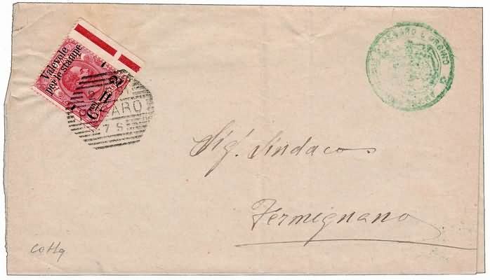 REGNO D'ITALIA - 1891, Umberto I, Valevole per le stampe, 2 su 50 c. carminio, bordo di foglio a destra con linea di colore laterale cpl. (52bae) su piego da Pesaro per Fermignano, 2/5/91. Rara e di bella qualità. (Cert. Colla).(LETTERA)