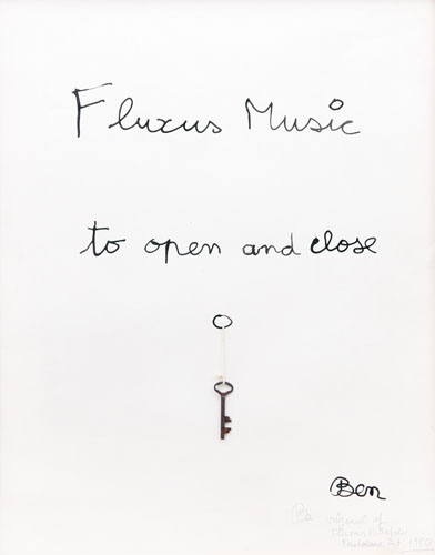 BEN VAUTIER Napoli 1935 Fluxus music to open and close, 1980 tecnica mista e applicazione su carta cm. 57x44, firma e anno in basso a destra, dichiarazione d'autenticità a cura della Fondazione Morra (NA) su foto.
