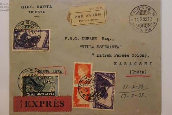 REGNO D'ITALIA - 1933, Posta aerea, aeroespresso da 2,25 lire (44) + 1,75 lire (254) coppia + 50 c. (332) 2 esemplari, su busta espresso per via aerea da Trieste per Karachi, 11/2/33.(LETTERA)