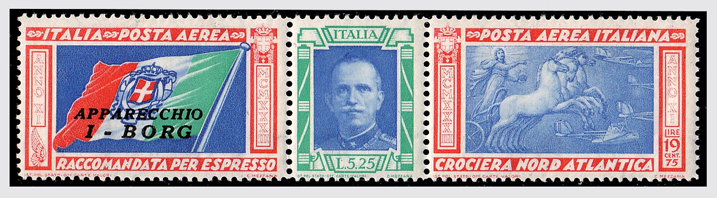 Lotto 2403 | REGNO D'ITALIA - 1933, Posta aerea, Trittico I-BORG con varietà "ciuffo"...