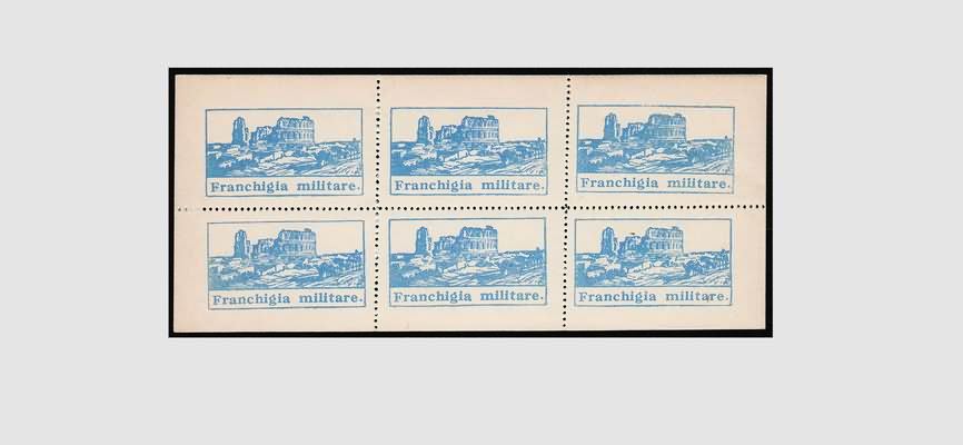 REGNO D'ITALIA - 1943, Franchigia militare, Anfiteatro di El Djem, foglietto azzurro oltremare (F1). (Cert. A. Diena). (Cert. R. Diena - Cert.Toselli 100/100).(GOMMA INTEGRA)