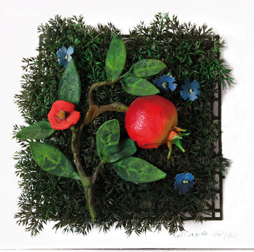 PIERO GILARDI Torino 03/08/1942 Melograno, 2004 multiplo in poliuretano espanso e plastiche con supporto in plexiglass cm. 35x35, esemplare 30/30, firma in basso a destra, certificato firmato dall'artista allegato.