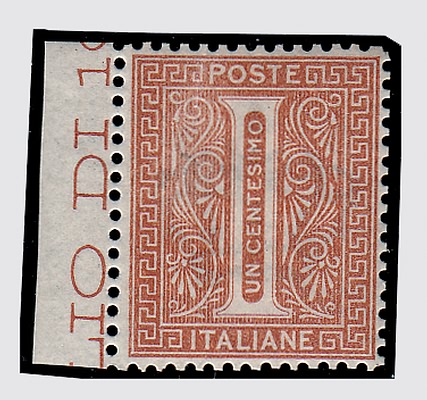 REGNO D'ITALIA - 1863, Prova di stampa della tipografia De La Rue del francobollo da 1 cent. nel colore ocra arancio non adottato. Presenta bordo di foglio a sinistra. Rarissimo. Cert.Sottoriva.(GOMMA INTEGRA)