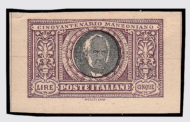 REGNO D'ITALIA - 1923, Saggi e Prove, Manzoni, 5 lire violetto e nero (156) prova di stampa realizzata su carta a macchina, paglierina non gommata. Ritocco a destra del contorno della foto. (Cert.Sottoriva).(SENZA GOMMA)