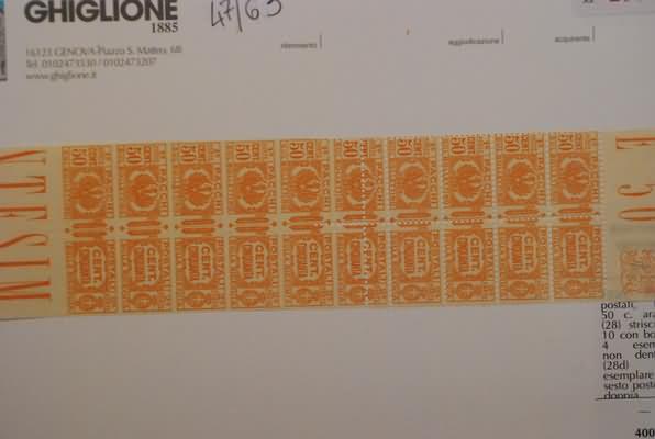 REGNO D'ITALIA VARIETA' - 1930, Pacchi postali, fasci, 50 c. arancio (28) striscia di 10 con bordi e 4 esemplari non dentellati (28d) + esemplare al sesto posto con doppia dentellatura (doppio pettine) (28Ib).(GOMMA INTEGRA)