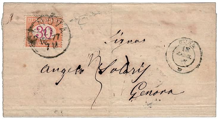 REGNO D'ITALIA VARIETA' - 1877, Segnatasse, 30 c. con cifre capovolte (7b) applicato a Genova, 23/12/77, su lettera non affrancata da Bosa. Rarità. (Cert. Raybaudi).(LETTERA)