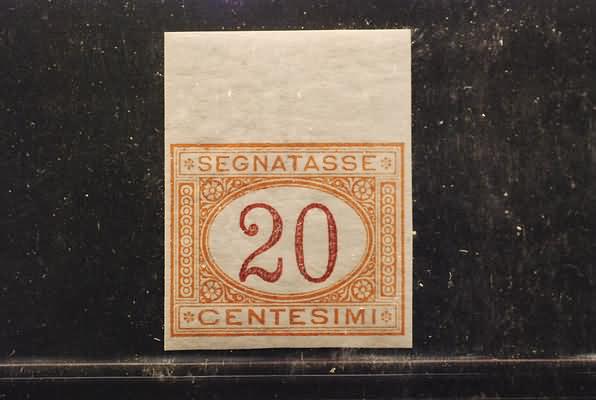 REGNO D'ITALIA VARIETA' - 1894, Segnatasse, 20 c. arancio e carminio (22g) non dentellato, bordo di foglio in alto, molto bello.(GOMMA INTEGRA)
