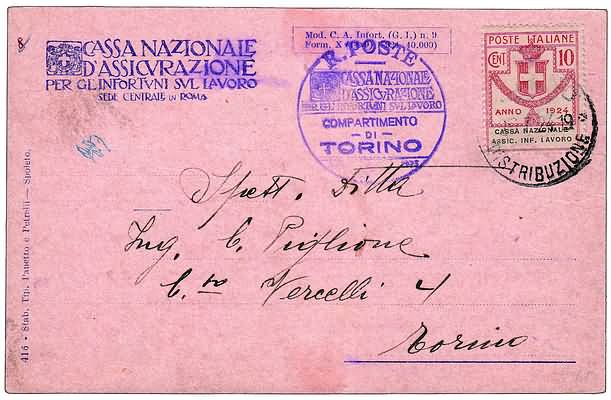 REGNO D'ITALIA VARIETA' - 1924, Parastatali, 10 c. Cassa Nazionale Assic. Inf. Lavoro con varietà "L" rotta (18d) su cartolina amministrativa da Torino per città, 24/7/24.(LETTERA)