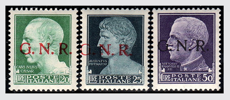 REPUBBLICA SOCIALE ITALIANA - 1944, GNR Verona, i tre alti valori di posta ordinaria, 20, 25, 50 lire (487/89) buona centratura.(GOMMA ORIGINALE)
