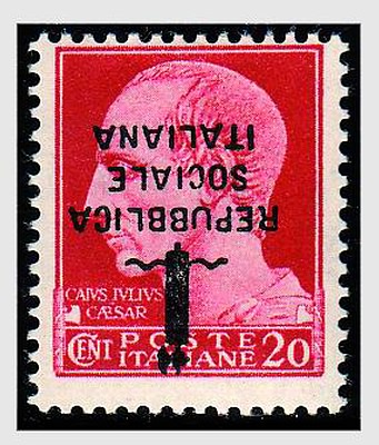 REPUBBLICA SOCIALE ITALIANA - 1944, 20 c. carminio con soprastampa capovolta...