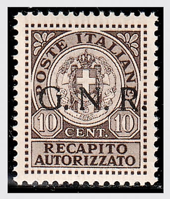 REPUBBLICA SOCIALE ITALIANA - 1944, Saggi Recapito Autorizzato, 10 c. soprastampa nera (P1). (Cert. B. S. Oliva. Cert. R. Diena).(GOMMA INTEGRA)