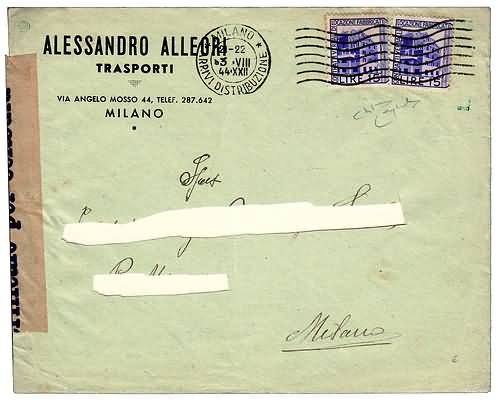 REPUBBLICA SOCIALE ITALIANA - 1944, Marche per contratti di locazione da 15 lire (Unificato 4) 2 metà di sinistra su busta da Milano per città, 3/8/44, non tassata. Indirizzo parzialmente ritagliato. Rarità.(LETTERA)