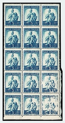 REPUBBLICA ITALIANA - 1945, Democratica, 5 lire blocco di 15 con stampa più o meno evanescente (555g).(GOMMA INTEGRA)