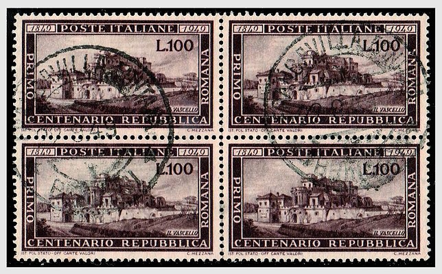 REPUBBLICA ITALIANA - 1949, Repubblica Romana 100 lire (600) in blocco di quattro.(USATO)