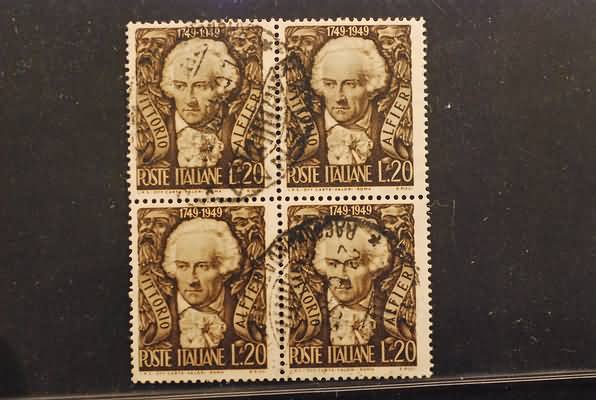 REPUBBLICA ITALIANA - 1949, Vittorio Alfieri, 20 lire bruno scuro (605) blocco di quattro.(USATO)