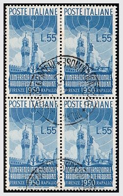 REPUBBLICA ITALIANA - 1950, Radiodiffusione, 2 valori cpl. (623/24) in quartine. (Cert. R. Diena).(USATO)