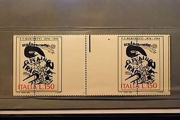 REPUBBLICA ITALIANA - 1976, Marinetti 150 lire con dentellatura verticale fortemente spostata (Specializzato 955Eb) coppia orizzontale con interspazio.(GOMMA INTEGRA)