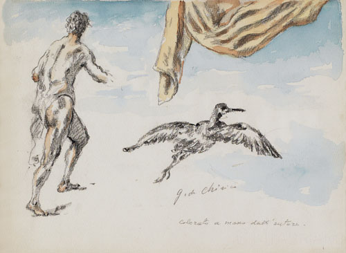 GIORGIO DE CHIRICO Volo (Grecia) 10/07/1888 - Roma 20/11/1978 Studio per uomo, uccello e tenda, seconda metà anni '60 tempera e acquerello su carta cm. 23,5x31,5; firma e dicitura "colorata a mano dall'autore" in basso a destra, timbri della Galleria Iolas (MI) al retro, opera registrata presso l'Archivio della Fondazione Giorgio e Isa De Chirico a cura del prof. Paolo Picozza su foto