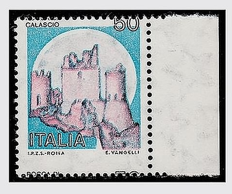 REPUBBLICA ITALIANA - 1980, Castelli, 50 lire Rocca di Calascio (1508) senza la stampa del giallo e con la dentellatura orizzontale spostata in senso verticale. (Cert. Raybaudi).(GOMMA INTEGRA)