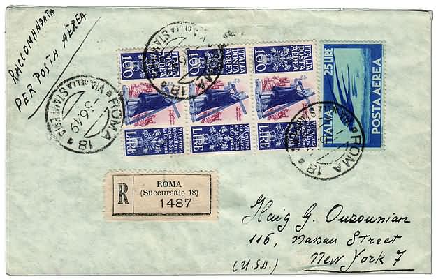 REPUBBLICA ITALIANA - 1949, Posta aerea, S.ta Caterina 100 lire (146) striscia verticale di 3 + 25 lire (131) su aerogramma raccomandato da Roma per N. York, 3/6/49.(LETTERA)