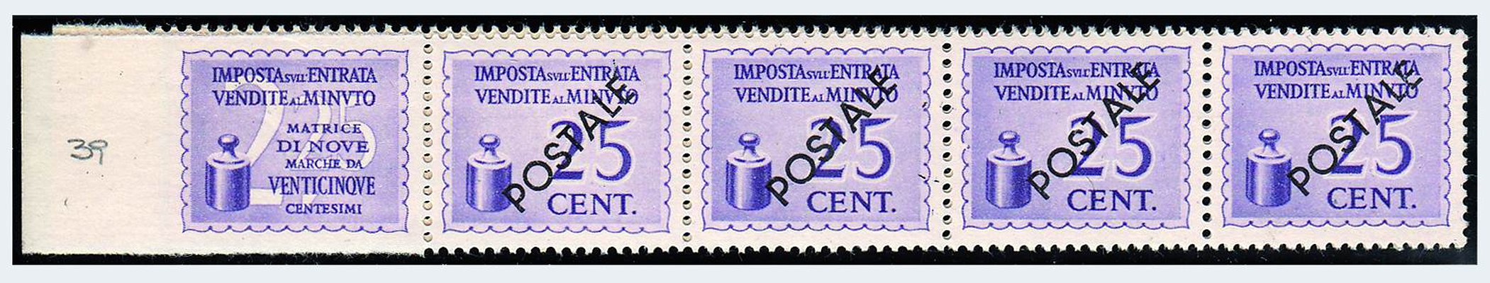 EMISSIONI LOCALI E C.L.N. - 1944, CASALECCHIO DI RENO, tre marche soprastampate "postale" in striscie di 5 unita alla matrice non soprastampata : 5 c.(1a) , 10 c.(2a), 25 c.(3a) (quest'ultima in striscia di 9). (Cert. Raybaudi).(GOMMA INTEGRA)