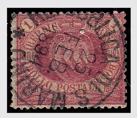 SAN MARINO - 1892, Stemma, 1 lira carminio su giallo (20). (Cert. G. Oliva. Cert. Sorani).(USATO)